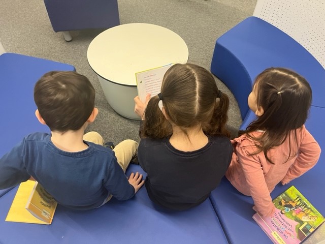 Die Übergabe der Bücherspende wurde von den Kooperationspartnern gleich in eine Vorleseaktion gebettet, die in der hauseigenen Bibliothek der Grundschule stattfand. 2-Klässler*innen zeigten stolz ihre Lesekünste und gaben Kindergartenkindern eine Leseprobe aus dem frischgespendeten Bestand.
